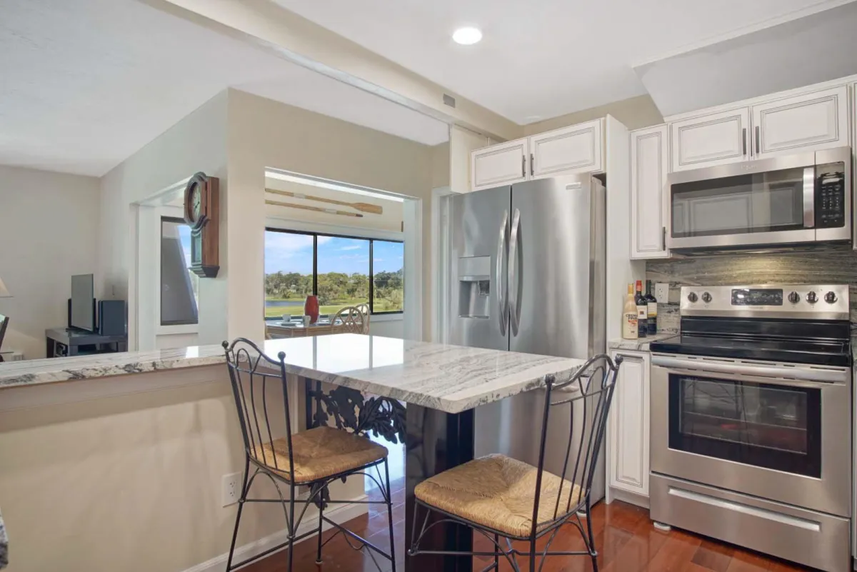 Experience relaxed elegance in this remodeled penthouse condo in a unique 55+ community. Featuring a NEW 2024 ROOF -assessment paid, PARTIAL IMPACT WINDOWS, elevator, high-end finishes like granite countertops and backsplash, expanded floorplan open to the breakfast room, and no popcorn ceilings. Enjoy one-of-a-kind breathtaking GOLF COURSE VIEW from your breakfast and living rooms, in-unit washer and dryer, and additional shared laundry facilities. Outdoor enthusiasts will love the newly rebuilt day dock for fishing or kayak launching, with kayak storage. The vibrant community offers 3 pools, tennis, pickleball, shuffleboard, fitness center, clubhouse, library, card room, and sauna. PET FRIENDLY with adjacent fenced dog park. Located on the St. Lucie River, bordering Sailfish Golf Course, and just 5 mins from Hutchinson Island beaches or downtown Stuart shopping. Secure, social, and surrounded by the best of coastal Florida. Don't miss this luxury living opportunity at a great price!